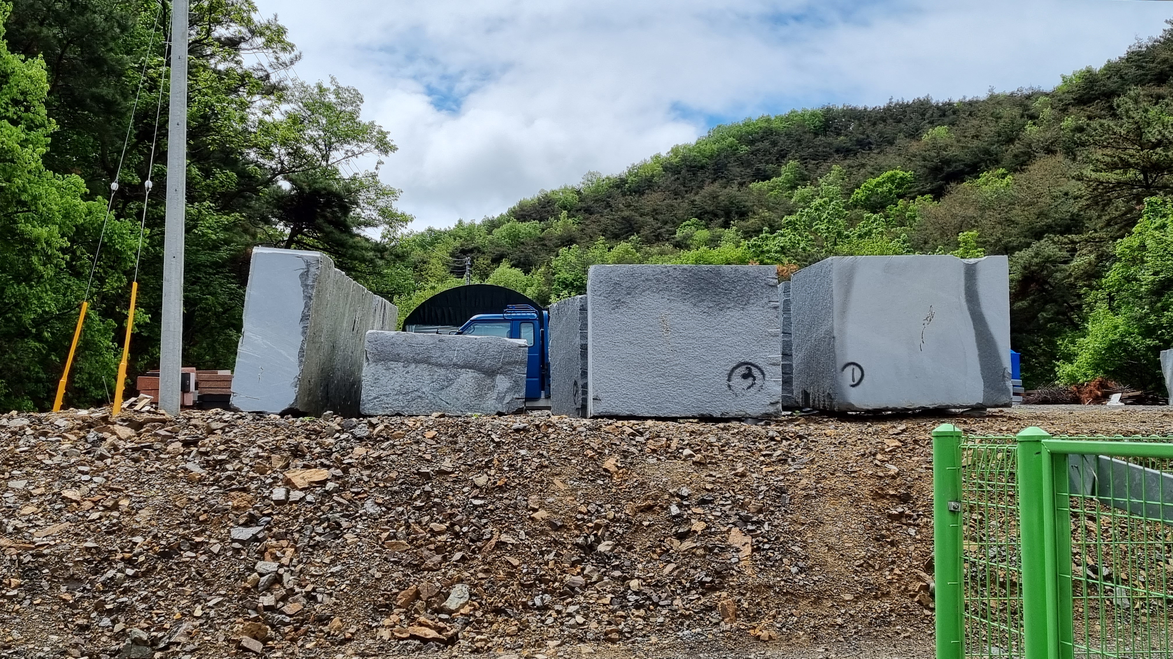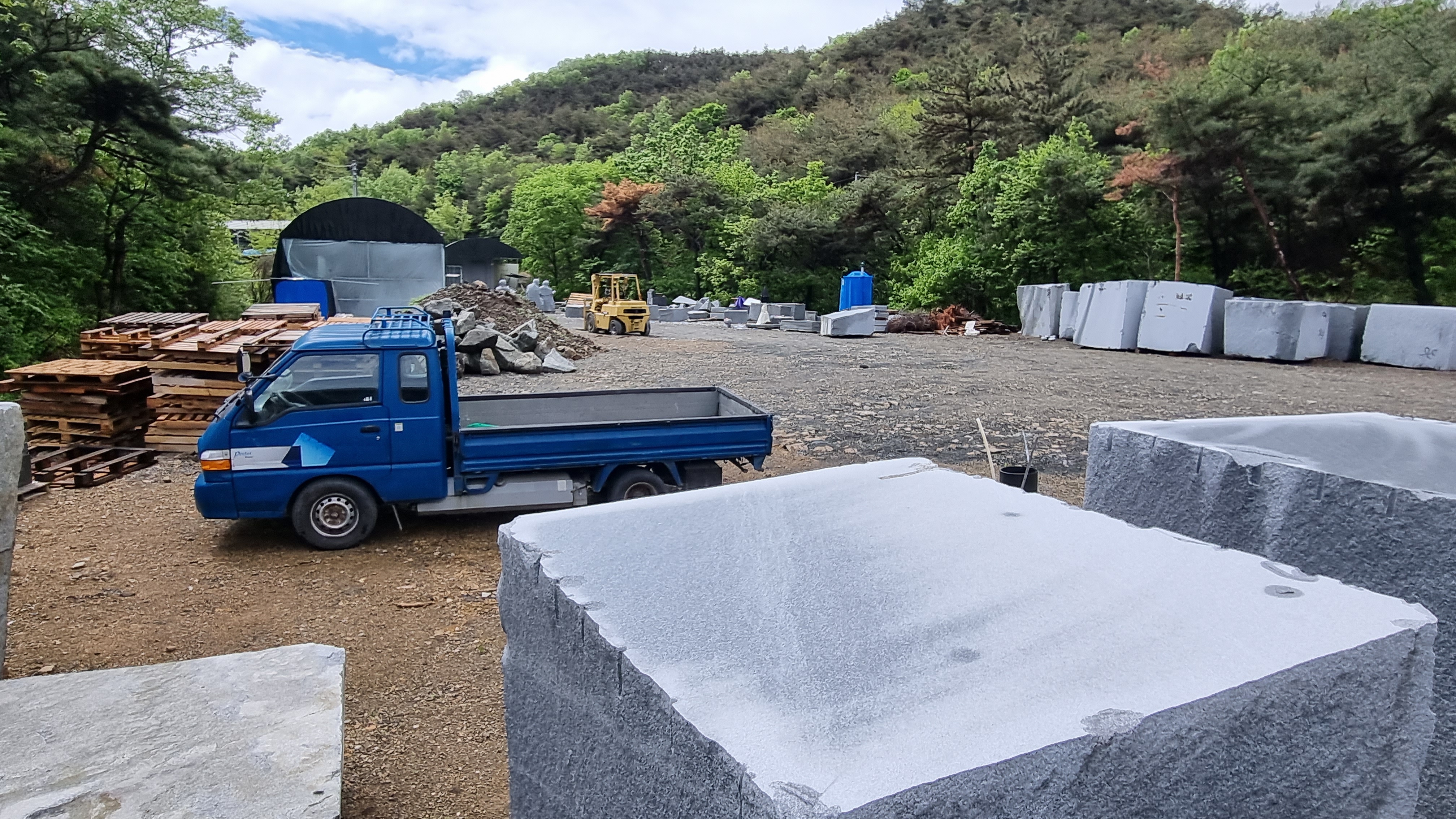 현장에는 석물에 필요한 큰 돌과 장비 등이 가득 있다. 또 컨테이너 사무실로 보이는 컨테이너 사무실 앞에는 가스통, 산소통과 절에서 필요한 석물 완성품이 서 있고 지게차 트럭 등이 운행하다가 쉬고 있는 듯 했다.