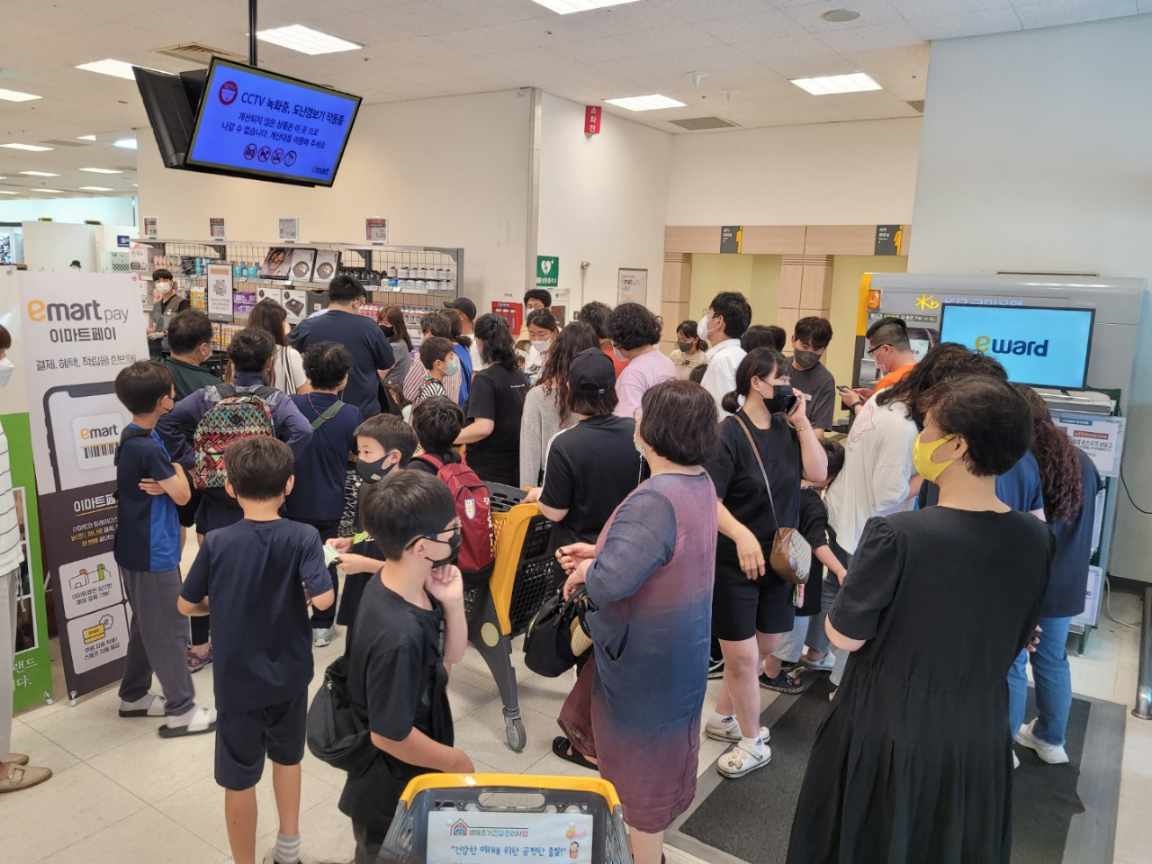 포켓몬빵 사러 온 시민들이 이마트 입구와 빵코너 앞에서 인산인해를 이루고 있다