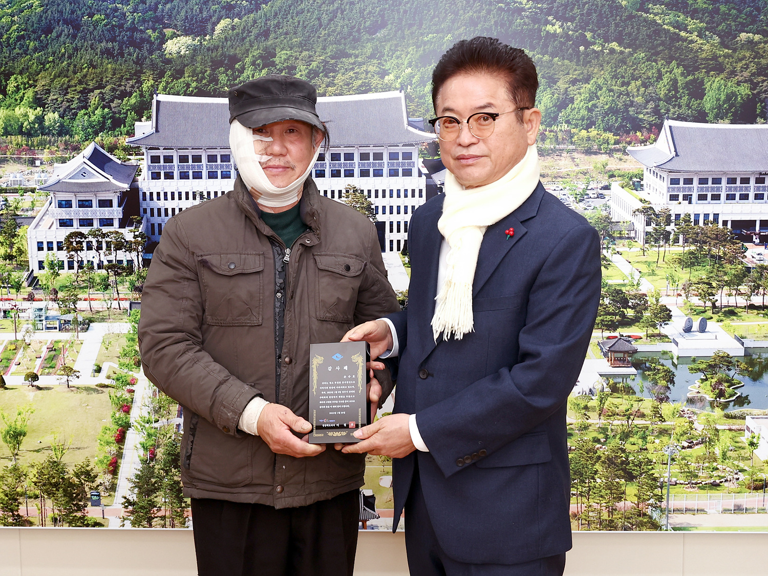 경상북도는 경주시 내남면 덕천리 화재 현장에서 거센 화염을 뚫고 주택 내부에 고립된 노부부를 구한 손수호(68세)씨에게 1월 26일 도지사 접견실에서 감사패를 수여했다.